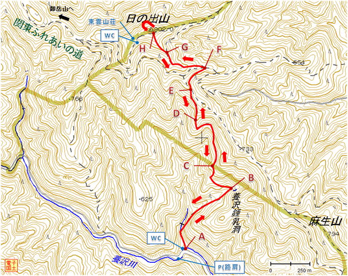| 地点名 | 分岐 | 〜 | 分岐 | 〜 | 日の出山 山頂 |