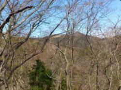 新芽が出始めたばかりで淡い緑の雑木林の間から、目指す大霧山を眺めつつ一旦下って行くと(写真上)、獅子岩(Map C)に着きました。